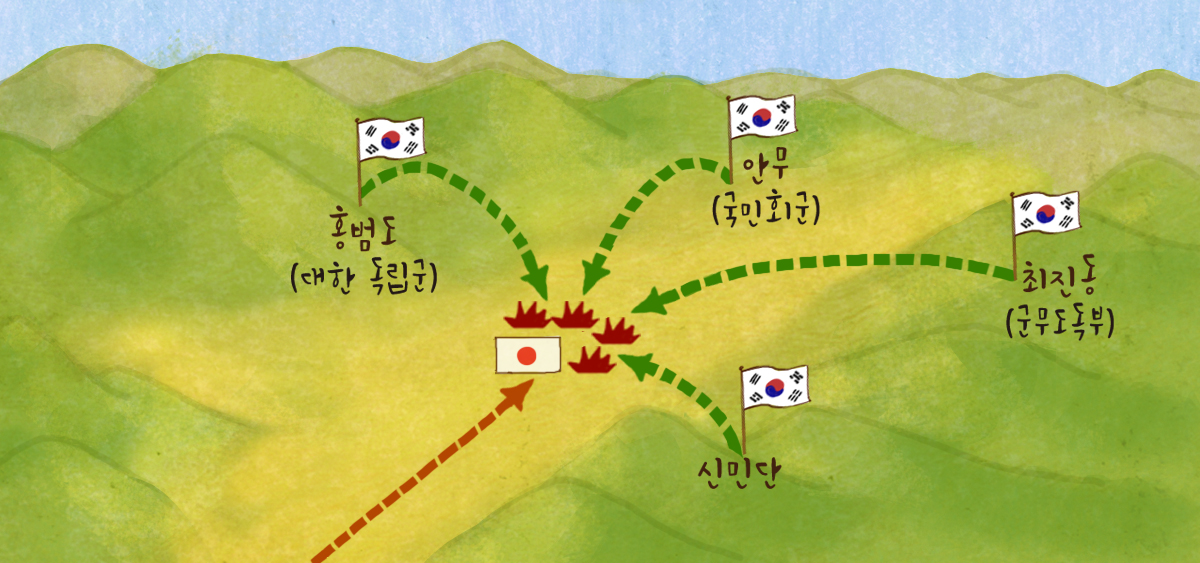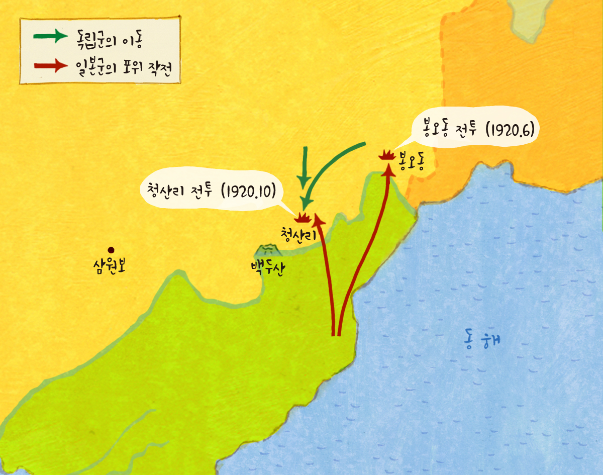 봉오동 전투에 크게 패한 일본군은 가만히 있지 않았어요. 일본군은 대규모 병력을 더 보내서 독립군을 탄압하고자 했어요. 당시 300여 명의 독립군을 이끈 홍범도는 대한 독립군만으로는 일본군의 공격에 맞서기 힘들다고 생각했어요. 그래서 김좌진이 이끈 북로 군정서 등의 여러 독립군 부대와 연합하여 백두산 일대로 이동했어요. 마침내 일제는 1만 5천여 명의 대규모 일본군을 동원하여 독립군을 공격하기 시작했어요.