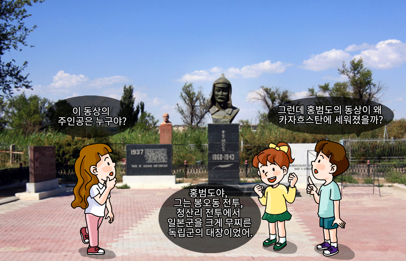1943년 76세의 나이로 홍범도는 파란만장한 삶을 마쳤어요. 그의 묘지는 지금도 크즐오르다 공동묘지에 있으며, 그의 생애를 존경한 동포들은 모금 운동을 펼쳐 홍범도의 동상을 그의 묘 앞에 세웠어요.