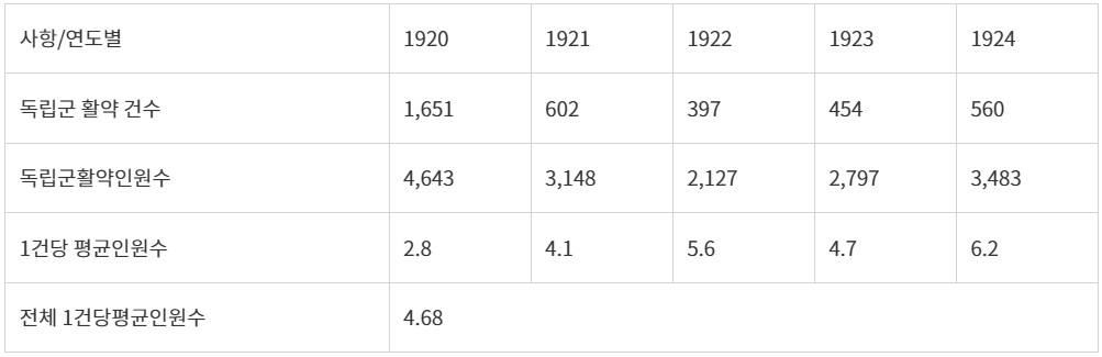 1920년에서 1924년에 걸친 국경 3도(평북·함남·함북)에 있어서의 항일무장독립군의 활약 건수와 그 인원에 나타나는 독립항전의 형태(규모)를 보면 〈표 6〉과 같다.