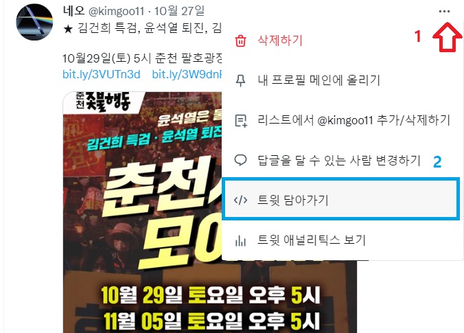 1. 트윗의 우측 상단을 누르고