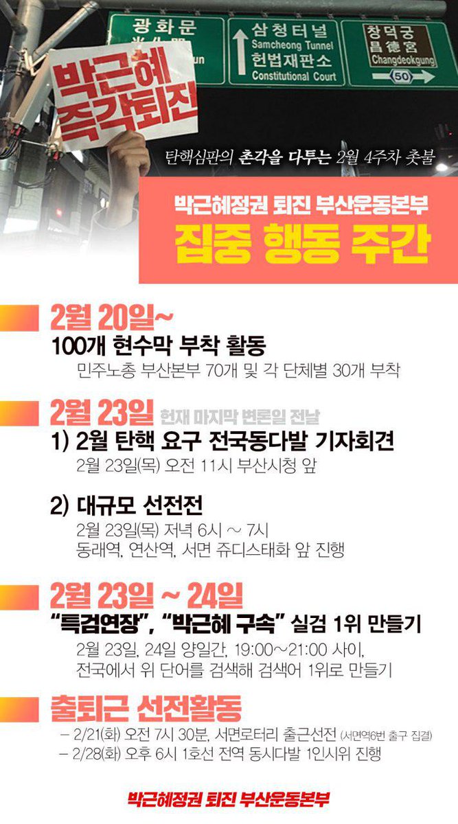 ▶ 2월24일(금) 3시 대치동 특검 앞 - 5시45분 강남역-신논현역 - 7시 강남역 12번 출구 하야하롹 강남편 - 10시 강남역 12번 출구 삼각김밥 문화제 - 광화문 캠핑촌 취침