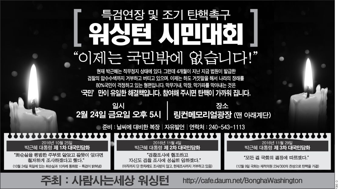 | 박근혜 퇴진 촛불집회 일정 (2월13일,14일,15일,16일,17일,18일,19일) (0) | 2017.02.12 |