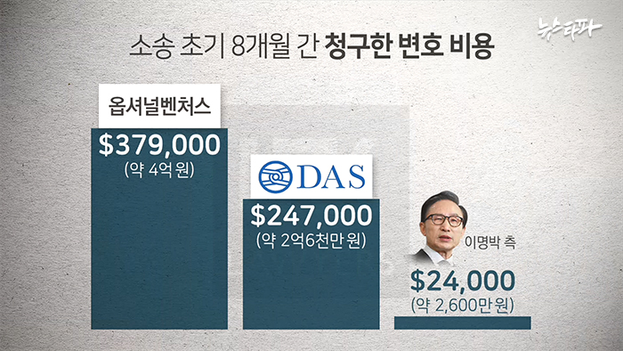 뉴스타파는 또 다스와 이명박 측이 김경준을 상대로 각종 소송을 진행하면서 발생한 거액의 변호사 비용을 김경준 횡령사건의 직접 피해자인 옵셔널벤처스에 떠넘겼다는 사실도 확인했다. 2004년 1월, 옵셔널을 김경준을 상대로 한 소송에 끌어들인 다스와 이명박 측이 옵셔널을 위한 소송은 제대로 진행하지 않으면서 거액의 변호사비만 챙긴 사실이 문서로 드러난 것이다. 뉴스타파는 2001년부터 2007년까지 다스에서 경리팀장으로 일했던 채동영 씨의 이메일에 남아 있는 소송비용 관련 자료를 분석해 이 같은 사실을 확인했다.
