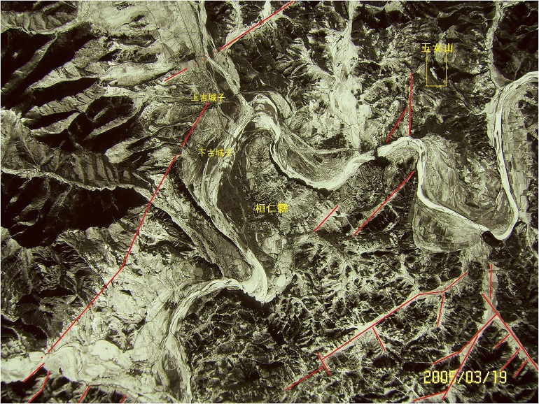 [그림 1] 환인 지역의 항공사진(1966. 1. 2.촬영자료) - 붉은 선은 선구조(단층 등)임