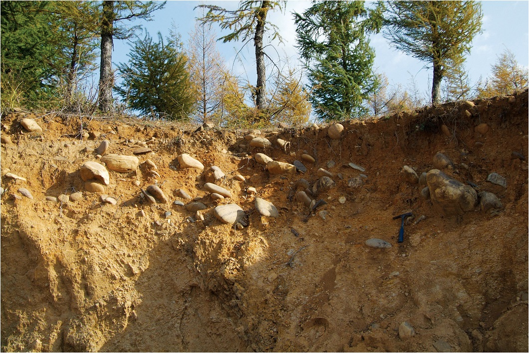 [그림 6] 미창구 장군묘가 자리잡은 상단 하안단구의 지표면에 노출된 단구퇴적물 - 원마도가 양호한 강돌을 볼 수있다.