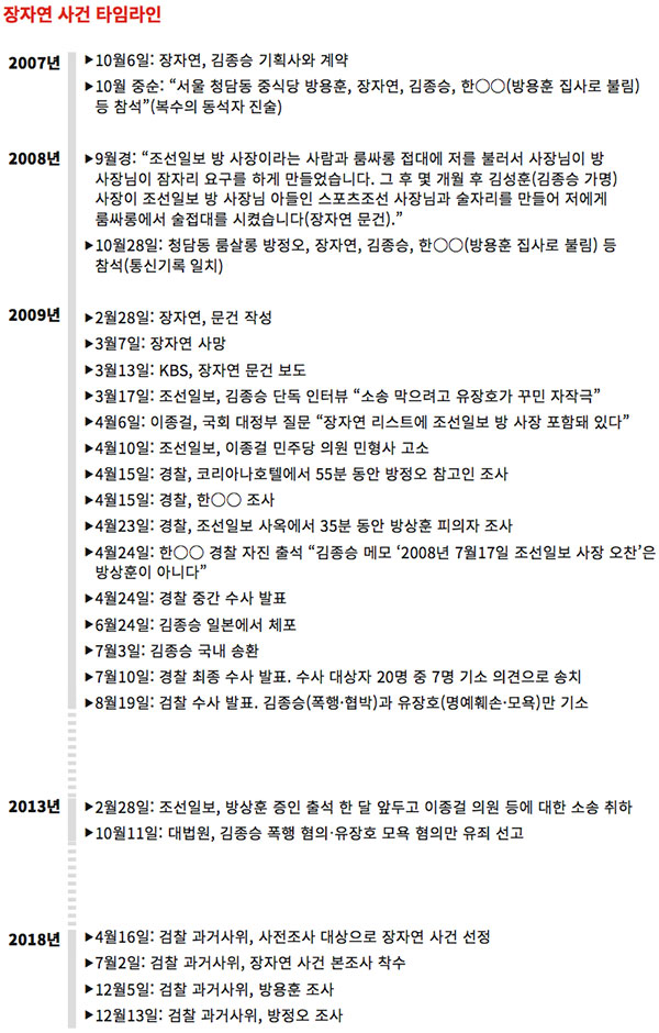 2009년 3월7일 배우 장자연씨는 스물아홉 살의 나이에 스스로 목숨을 끊었다. 숨지기 일주일 전, 성접대 등을 강요받았다는 문건(이하 ‘장자연 문건’)을 남겼다. “2008년 9월경 조선일보 방 사장이라는 사람과 룸싸롱 접대에 저를 불러서 사장님이 방 사장님이 잠자리 요구를 하게 만들었습니다. 그 후 몇 개월 후 김성훈 사장(기획사 대표)이 조선일보 방 사장님 아들인 스포츠조선 사장님과 술자리를 만들어 저에게 룸싸롱에서 술접대를 시켰습니다. … 저는 술집 접대부와 같은 일을 하고 수없이 술접대와 잠자리를 강요받아야 했습니다. 저는 나약하고 힘없는 신인 배우입니다. 이 고통에서 벗어나고 싶습니다. 2009. 2. 28 장자연(‘장자연 문건’ 원문 그대로 표기).”