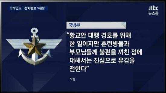 갑작스럽게 진행된 황 권한대행이 참석한 야외 수료식이 ‘황제 의전’이 아닌가에 대한 의문이 제기되자, 국방부는 “황교안 권한 대행 경호를 위해 한 일이지만, 훈련병들과 부모님들께 불편을 끼친 점에 대해서는 진심으로 유감을 표명한다”며 해명했다고 이야기했다.