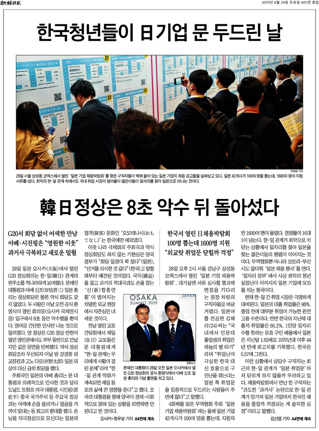 G20 정상회담에서의 한일 정상 간의 만남 장면에서 ‘국내 청년 취업 위기’를 연상케 한 보도도 있었다. 지난달 29일 조선일보 1면 <韓日 정상은 8초 악수 뒤 돌아섰다>라는 기사 제목 위에는 <한국 청년들이 일본 기업 문 두드린 날>이라는 제목, 그리고 서울 삼성동에서 열린 ‘일본 기업 채용박람회’ 현장 사진이 배치됐다.