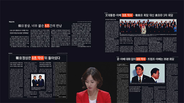 ‘8초 악수’를 부각한 언론이 조선일보만은 아니었다. G20 정상회의를 다룬 언론 보도들은 주로 짧은 악수 시간과 양국 정상의 분위기를 전하는 데에 주목했다. "아베 총리는 다른 정상과 기념사진을 찍을 때는 포용을 하고 치아가 보일 정도로 웃기도 했다”(중앙일보), “문 대통령은 이날 회의장을 오갈 때 일본이 제공한 도요타 센추리와 렉서스 LS 하이브리드 등을 이용하지 않고 평소 타던 검은색 벤츠에 탑승한 것으로 알려졌다.”(동아일보) 등의 현장 묘사들이 주를 이뤘다.