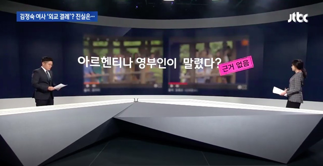 이에 JTBC 뉴스룸에서는 “원본 영상을 보면 아르헨티나 영부인이 김 여사를 제지했다기보다는 여러 사람 사이에서 대화를 이어가는 모습이 확인된다. 또 김 여사의 팔짱을 먼저 낀 것은 프랑스 영부인이고, 김 여사를 제지했다는 아르헨티나 영부인은 지난해 자신의 나라에서 열린 G20 회의에서 프랑스 영부인의 팔짱을 낀 사진을 직접 SNS에 올리기도 했다. 외교 결례에 해당하는 행동이라고 볼 수 없다”라는 '팩트체크' 보도를 하기도 했다.