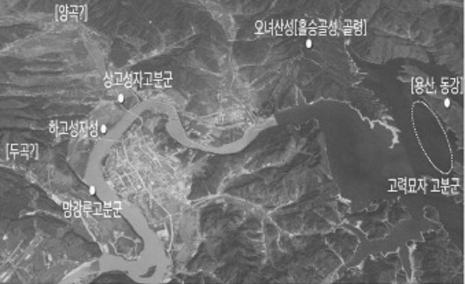 앞서 제시한 환인 지역 고구려 유적 지도를 다시 보자. 오녀산성의 동남쪽으로 고력묘자(古力墓子) 고분군이 위치하고 있다. 이 고분군은 지금은 환인댐으로 만들어진 거대한 저수지에 잠겨 있다. 이 고력묘자 고분군 동쪽과 남쪽에는 산줄기가 남북으로 이어지는데, 이 산줄기를 주몽왕의 장지로 기록된 용산쯤에 비정할 수 있겠다. 주몽왕의 장지 역시 아무래도 당시 공동 장지였을 고력묘자 고분군 안에 위치하였을 가능성이 높다. 두 번째 도읍지인 국내성이 위치한 집안시에서도 거대한 왕릉이 다른 고분들과 함께 고분군을 이루고 있음에서도 짐작할 수 있다.