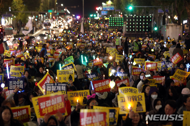 【서울=뉴시스】 이윤청 기자 = 온라인 커뮤니티 루리웹 회원들로 구성된 '북유게 사람들' 회원들과 시민들이 26일 서울 서초구 서초역-교대역 사이에서 검찰규탄 촛불집회를 열고 정경심 동양대학교 교수의 석방, 공수처 설치 등을 촉구하고 있다. 2019.10.26.