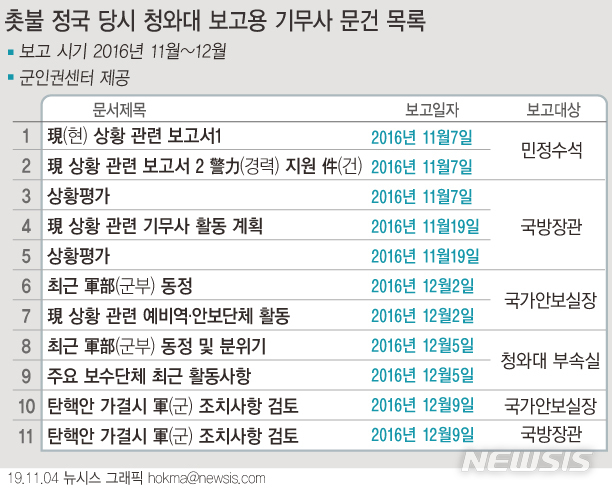 여기에 따르면 기무사가 이 기간 동안 청와대 등에 총 11개 문건을 보고했다.