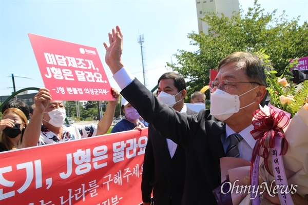 ▲ 국민의힘 대선 에비후보인 최재형 전 감사원장이 지난 6일 오전 경북 구미 박정희 전 대통령 생가 앞에서 지지자들로부터 꽃다발을 전해받은 후 손을 들어 인사하고 있다. ⓒ 조정훈