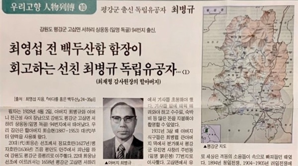 ▲ <미수복강원민보> 제15호(2021. 6. 25)에 실린 "독립유공자" 최병규... 최근 발간된 <미수복강원민보>의 "우리고장 인물열전(10)"에 "최영섭 전 백두산함 함장이 회고하는 선친 최병규 독립유공자"라는 제목으로 장문의 기사가 실렸다. 이 기사는 최영섭의 책 <바다를 품은 백두산>에 실린 최병규의 독립운동 이야기가 그대로 나온다. ⓒ 미수복강원민보