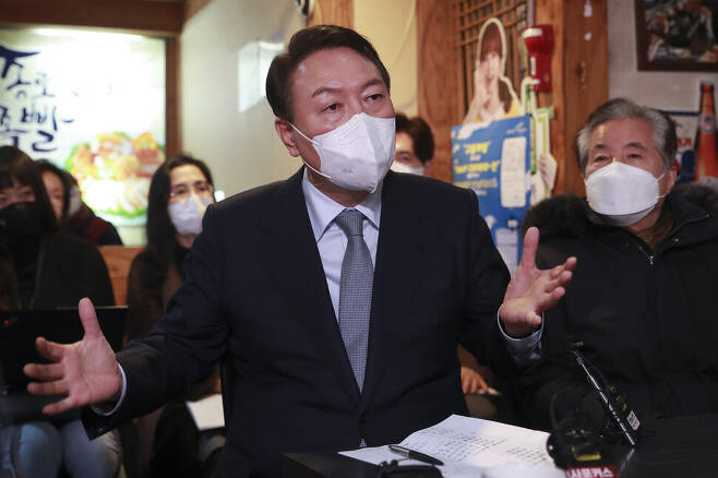 국민의힘 윤석열 대선 후보가 지난 2일 오후 서울 종로구 한 족발집에서 열린 코로나19 자영업 피해 현장 간담회에서 발언하고 있다. 국회사진기자단