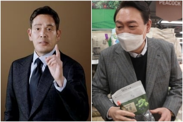 '멸공' 릴레이 당사자 정용진 신세계그룹 부회장과 지난 8일 이마트에서 멸치와 콩을 사고 있는 윤석열 국민의힘 대선후보. SNS