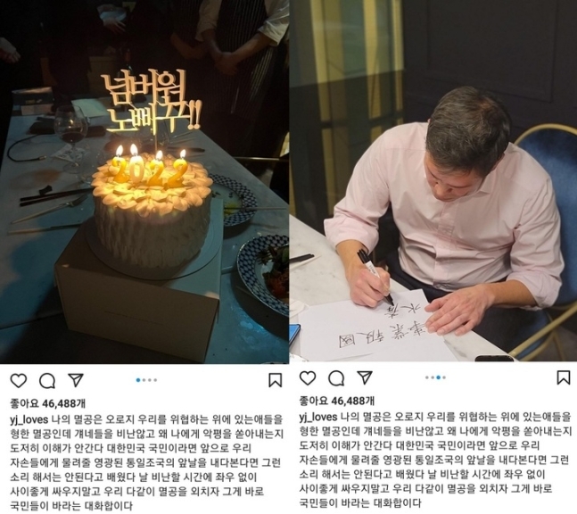 정 부회장은 이날 '넘버원 노빠꾸'라고 쓰인 케이크 사진을 올리고, "나의 멸공은 오로지 우리를 위협하는 위에 있는 애들을 향한 멸공으로 걔네들을 비난 않고 왜 나에게 악평을 쏟아내는지 도저히 이해가 안 간다"라며 "좌우 없이 사이좋게 싸우지 말고 우리 다 같이 멸공을 외치자"라고 또다시 색깔론을 재점화했다.