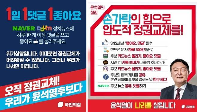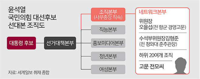 ‘네트워크본부 요청사항’이라며 윤 후보의 유튜브 채널 구독자 수를 ‘오늘 밤 11시까지 23만명으로 만들어 달라’는 지시도 내려졌다. 정치뉴스에는 ‘1일 1댓글, 1좋아요’를 달라고 독려하는 포스터가 올라왔다. 네트워크본부는 윤 후보 경호와 관련해서도, 선대본부 공식 수행팀과 별도로 현장지원팀이란 사설 경호팀을 꾸렸는데 이들이 폭언을 하고 사람들을 거칠게 밀치는 등 물의를 빚어도 선대본부가 제어하지 못한다고 한다.
