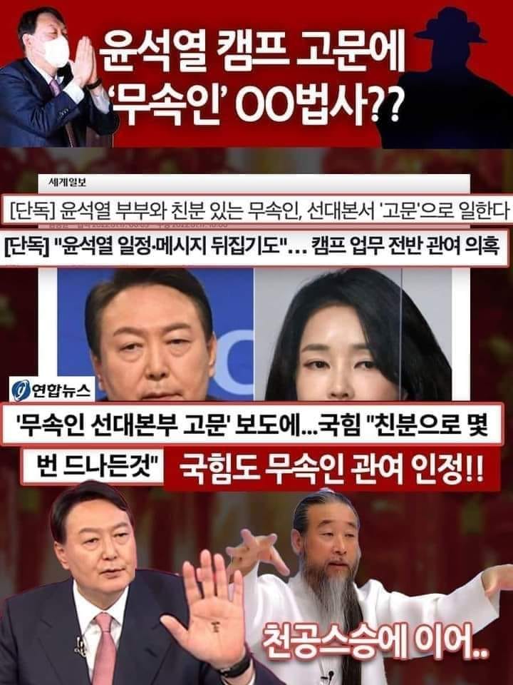 앞서 '세계일보'는 지난 17일 무속인 전씨가 국힘 선거대책본부 산하 네트워크본부에서 활동하면서 윤 후보의 메시지와 일정, 인사에 관여했다는 내부 증언이 나왔다고 보도했다. 신천지 이만희 총회장 문제에 대해서도 '부드럽게 하라'고 윤 후보에게 조언했다는 내용도 담겼다.