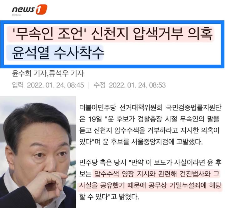 지난 19일 민주당 선거대책위원회 국민검증법률지원단은 "윤 후보가 검찰총장 시절 무속인의 말을 듣고 신천지 압수수색을 거부하라고 지시한 의혹이 있다"라며 윤 후보를 서울중앙지검에 고발했다.