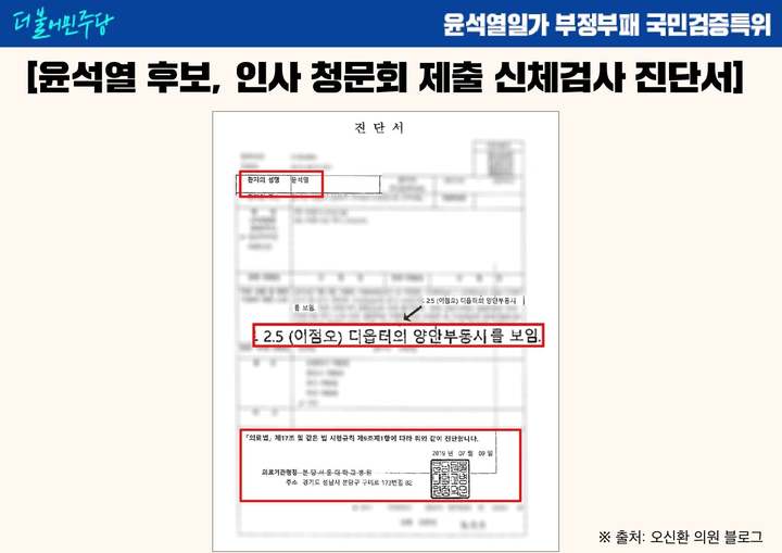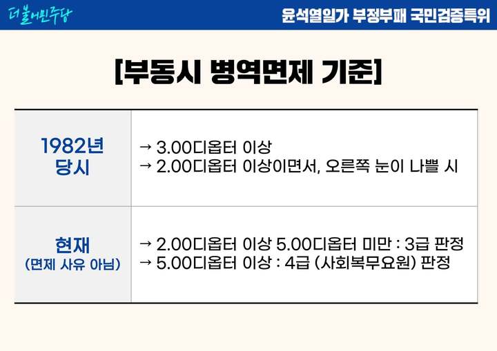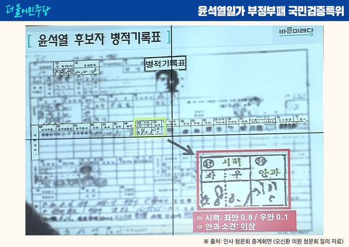 민주당은 윤 후보가 지난 2019년 검찰총장 인사청문회 때 공개한 병적기록에는 양쪽 눈의 시력차이가 0.7(좌안 0.8, 우안 0.1)이었으나, 1994년과 2002년 검사 임용과 재임용 당시 신체검사에는 시력차가 각각 0.2와 0.3으로 부동시 판정에 미치지 않는다는 추가 제보를 공개했다.