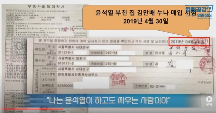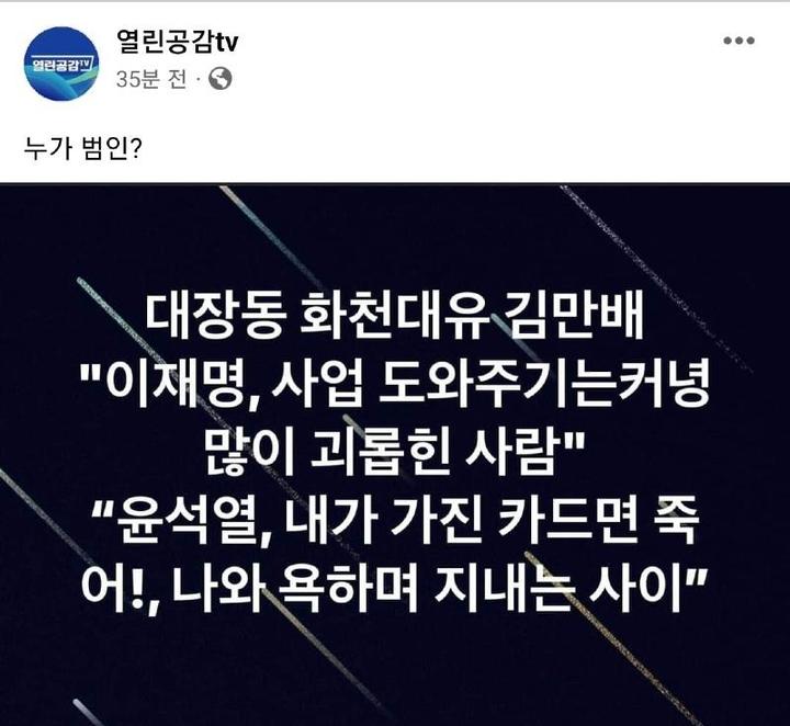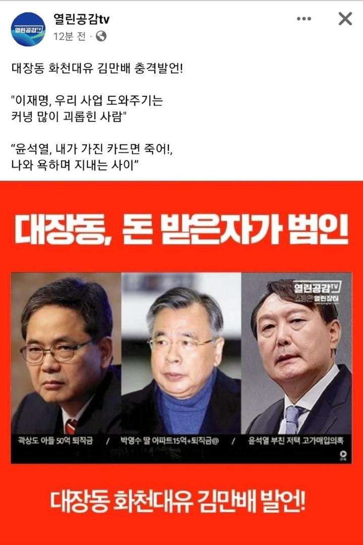 '열린공감 TV'는 최근 공개한 녹취록에서 화천대유 대주주 김만배씨는 정영학 회계사(화천대유 계열사 천화동인5호)에게 “나는 윤석열이하고도 싸우는 사람”, “윤석열이는 형이 가지고 있는 카드면 죽어” "이재명, 사업 도와주기는커녕 많이 괴롭힌 사람"이라고 말했다.