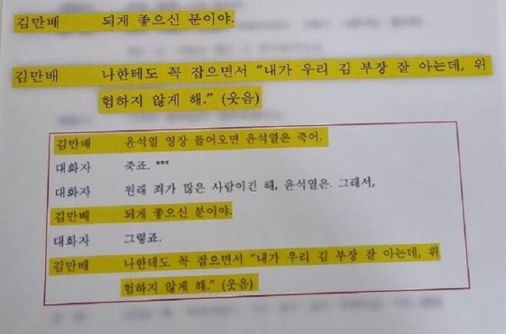 녹취록에 따르면 김씨는 정씨에게 "윤석열 영장 들어오면 윤석열은 죽어"라고 했고, 그러자 정씨는 "죽죠. 원래 죄가 많은 사람이긴 해. 윤석열은"이라고 답했다.