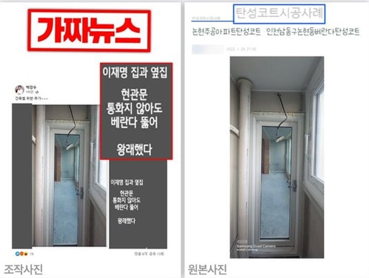 지난해 윤석열 캠프에 소속되어있던 정연태 한국SNS산업진흥원 원장과 박강수 시사포커스 회장 등은 최근 자신들이 운영하는 블로그와 페이스북에 ‘건축법 위반 추가’라는 짧은 코멘트와 함께 “이재명 집과 옆집 현관문 통하지 않아도 베란다 뚫어 왕래했다”라는 설명이 붙은 아파트 베란다 사진을 공개했다.