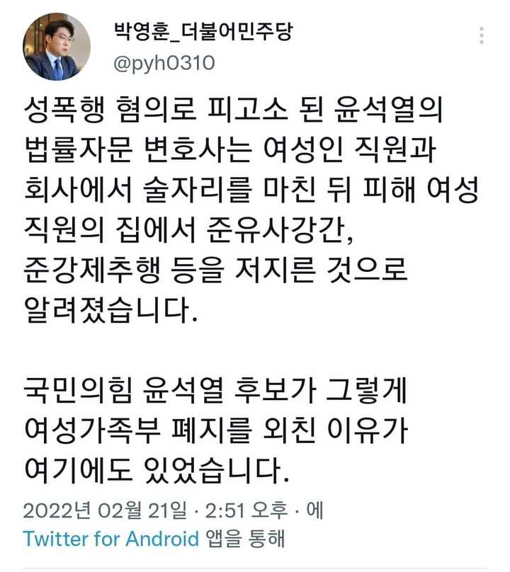 그는 "성폭행 혐의로 피고소 된 윤석열의 법률자문 변호사는 여성인 직원과 회사에서 술자리를 마친 뒤 피해 여성 직원의 집에서 준유사강간, 준강제추행 등을 저지른 것으로 알려졌다"라며 "국민의힘 윤석열 후보가 그렇게 여성가족부 폐지를 외친 이유가 여기에도 있었다"라고 꼬집었다.