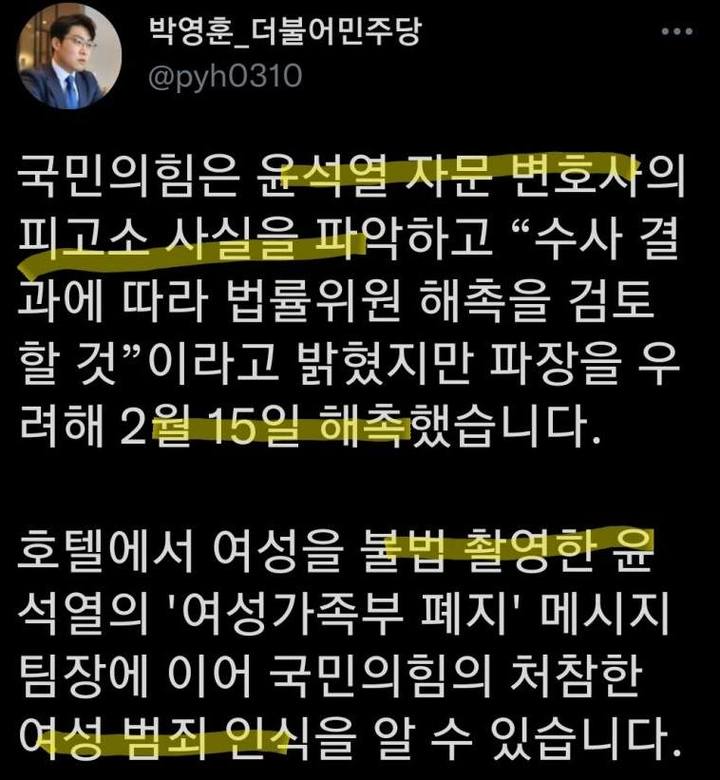 박 위원장은 "국민의힘은 윤석열 자문 변호사의 피고소 사실을 파악하고 '수사 결과에 따라 법률위원 해촉을 검토할 것'이라고 밝혔지만 파장을 우려해 2월 15일 해촉했다"라며 "호텔에서 여성을 불법 촬영한 윤석열의 '여성가족부 폐지' 메시지 팀장에 이어 국민의힘의 처참한 여성 범죄 인식을 알 수 있다"라고 비판했다.
