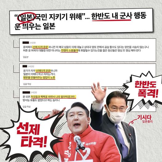 윤 후보의 앞선 '선제타격' 발언 이후 일본도 한반도 폭격을 이야기 하는 모양새가 됐다. 윤 후보가 이번 토론회에서 유사시 한반도내 자위대 허용 발언 맥락과 함께 우려의 시선이 커지고 있다. 윤 후보는 비록 유사시라고 토를 달았지만 과거 식민지배한 나라의 병력 주둔을 한반도에 허용할 수도 있다는 주장은 도저히 수용하기 어렵다는 비판이 이어지고 있다.