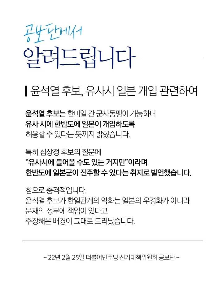 더불어민주당 선거대책위원회 공보단도 입장문을 통해 "윤 후보는 한미일간 군사동맹이 가능하며 유사시 한반도에 일본이 개입토록 허용할 수 있다는 뜻까지 밝혔다"라며 "참으로 충격적이다. 윤 후보가 한일관계 악화는 일본의 우경화가 아니라 문재인 정부에 책임이 있다고 주장해온 배경"이라고 지적했다.
