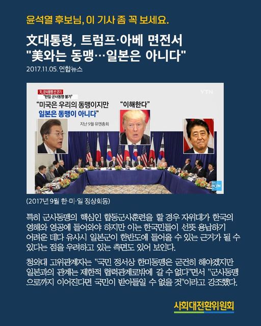 과거 우리 정부가 한미일 동맹을 공개적으로 거론하지 않은 것은 일제 강점 등 한일관계의 역사적 특수성 때문에 유사시 일본 자위대의 한반도 개입까지 상정하는 한미일 동맹을 우리 국민이 결코 받아들이지 않기 때문이었다. 이날 윤 후보가 한미일 군사동맹 검토 필요성을 꺼낸 것은 '중대한 실언'이란 비판이 제기된다.