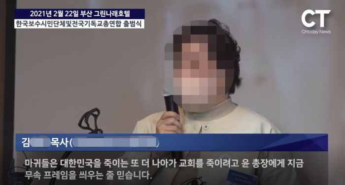 김건희의 고모 김모 목사가 지난 2월 22일 부산 그린나래호텔에서 열린 한국보수시민단체 및 전국기독교총연합 출범식에서 발언하고 있다. (사진=크리스천투데이 유튜브 영상 캡처)