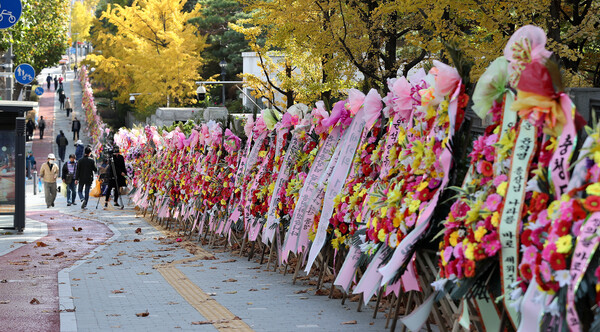 지난 2020년 10월 28일 오후 서울 서초구 대검찰청 앞 거리에 윤석열 지지자들이 보낸 화환이 늘어서 있다. 윤석열 검찰총장을 응원하는 내용으로 대검찰청 정문 앞에 설치된 이 화환들은 300개를 넘겼다. (사진=뉴스1)