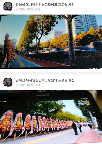 실제 김 목사의 카카오톡 프로필 과거 사진 내역에는 2020년 10월 21일과 29일 대검찰청 앞 화환을 촬영한 사진이 담겨있다.