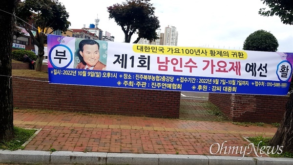진주예총 소속 진주연예협회(지부장 진창환)는 '대한민국 가요 100년사 황제의 귀환'이라는 제목으로 제1회 남인수 가요제(예선)를 열기로 했다. 최근 거리 곳곳에는 '부활'이라는 단어와 함께 펼침막이 내걸렸다.