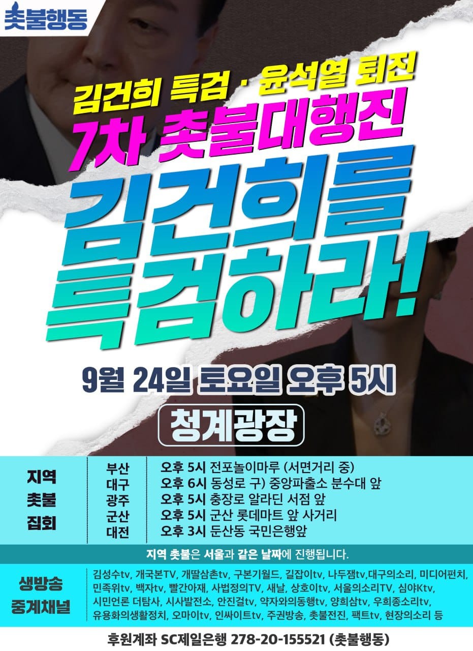서울 9월24일(토) 5시 청계광장/세종로 파이낸스 앞 김건희 특검, 윤석열 퇴진 7차 촛불 대행진