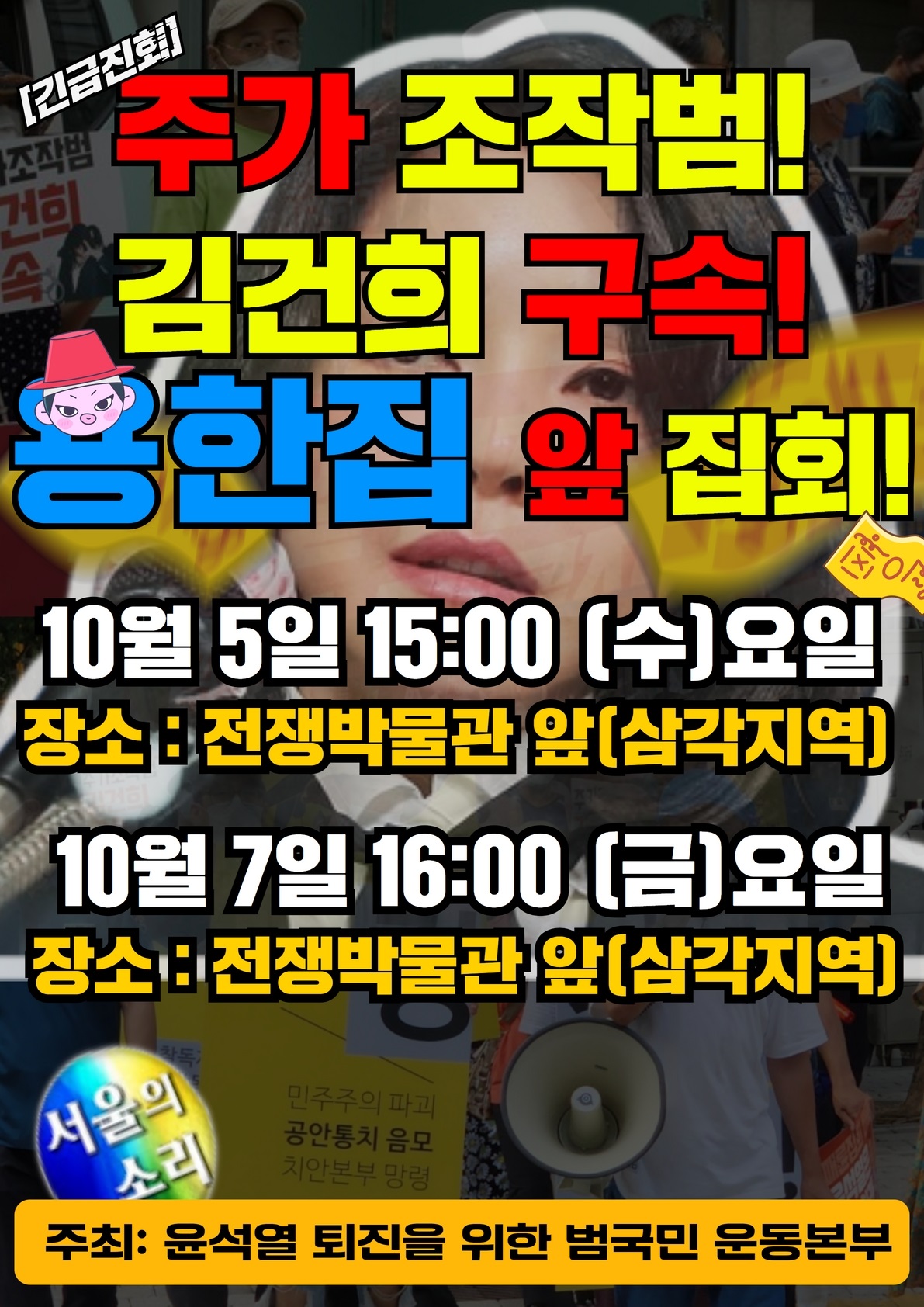 서울 10월5일(수) 3시 용산 전쟁박물관 (삼각지역) 주가조작범 김건희 구속 용한집 앞 집회