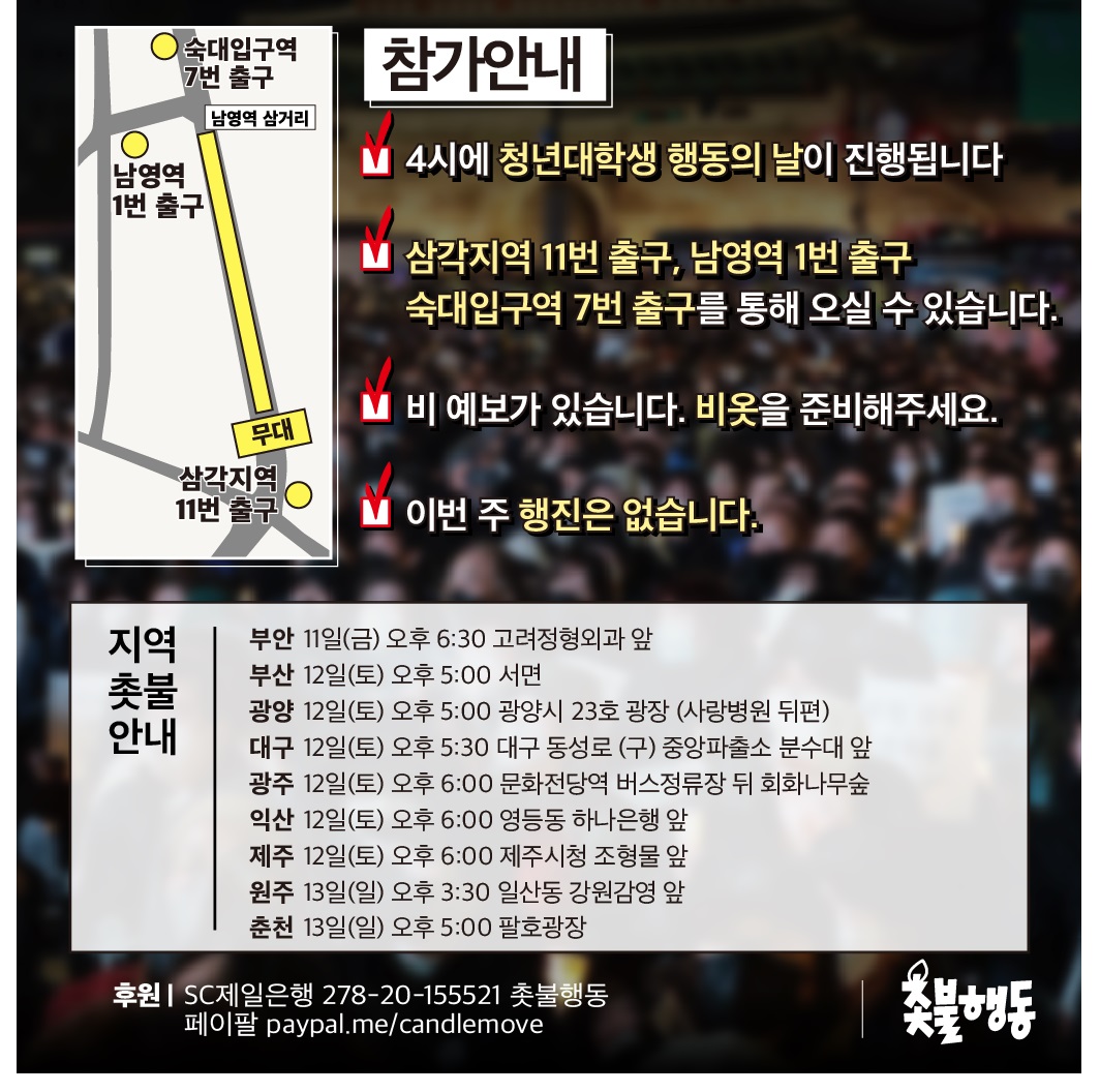 집회장소는 삼각지역 11번 출구에서 1번 출구로 변경되었습니다.