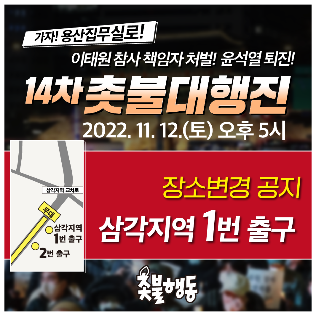 서울 11월12일(토) 5시 삼각지역 1번 출구 이태원 참사 책임자 처벌, 윤석열 퇴진 14차 촛불대행진