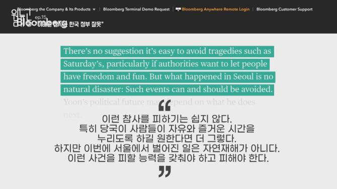 "한국에서 축제가 열렸지만 (정부의) 부실한 관리와 잘못된 의사 결정 때문에 200명에 가까운 사람들이 목숨을 잃고 수십 명이 부상당했습니다."