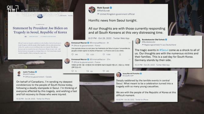"군중 밀집에 앞서 인파를 통제하는 충분한 조치가 없었습니다. 서울에서는 끊임없는 집회, 정치적 시위에 경찰이 대규모로 동원돼 통제합니다. 현장 목격자들의 말에 따르면 토요일 밤에 그런 통제는 없었습니다."