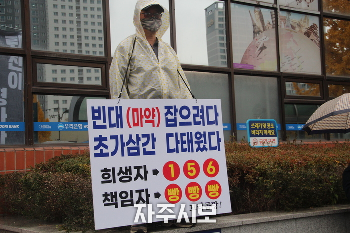가을 궂은비가 오는 가운데도 시민들은 ‘윤석열 퇴진’, ‘퇴진이 추모다’라는 선전물을 들고 삼각지역으로 모이고 있다.