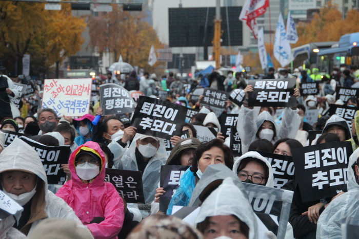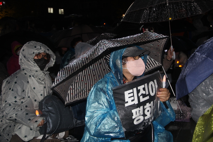 오후 내내 늦가을 비가 내려 일찍 어두워진 거리에 연인원 약 4만여 명(주최 측 추산)의 시민이 모여 우비를 입거나 우산을 든 채 집회장을 지켰다.