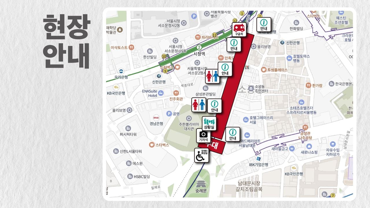 행진 경로 : 숭례문 - 명동 - 울지로 - 종각 - 안국 - 광화문 - 시청 - 숭례문