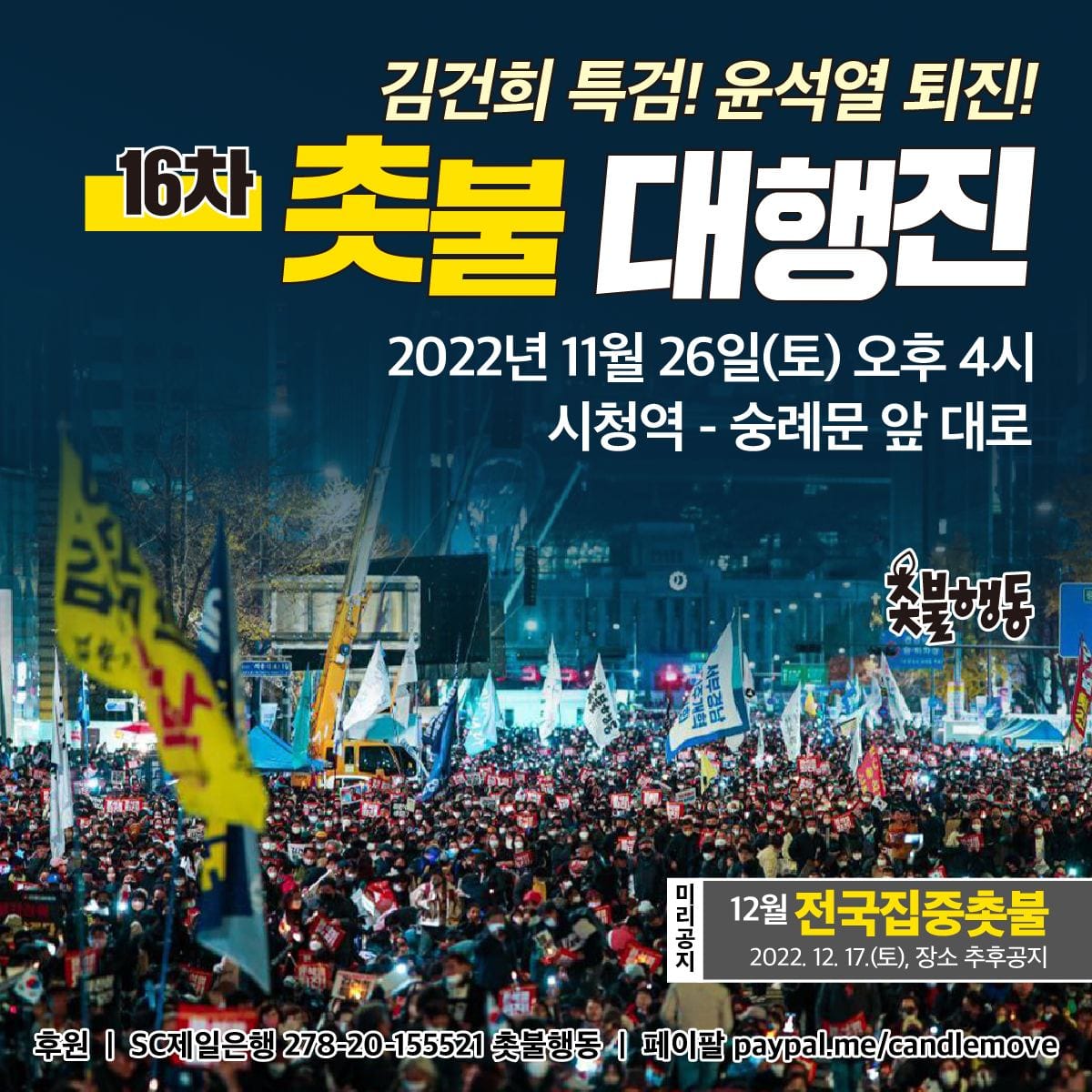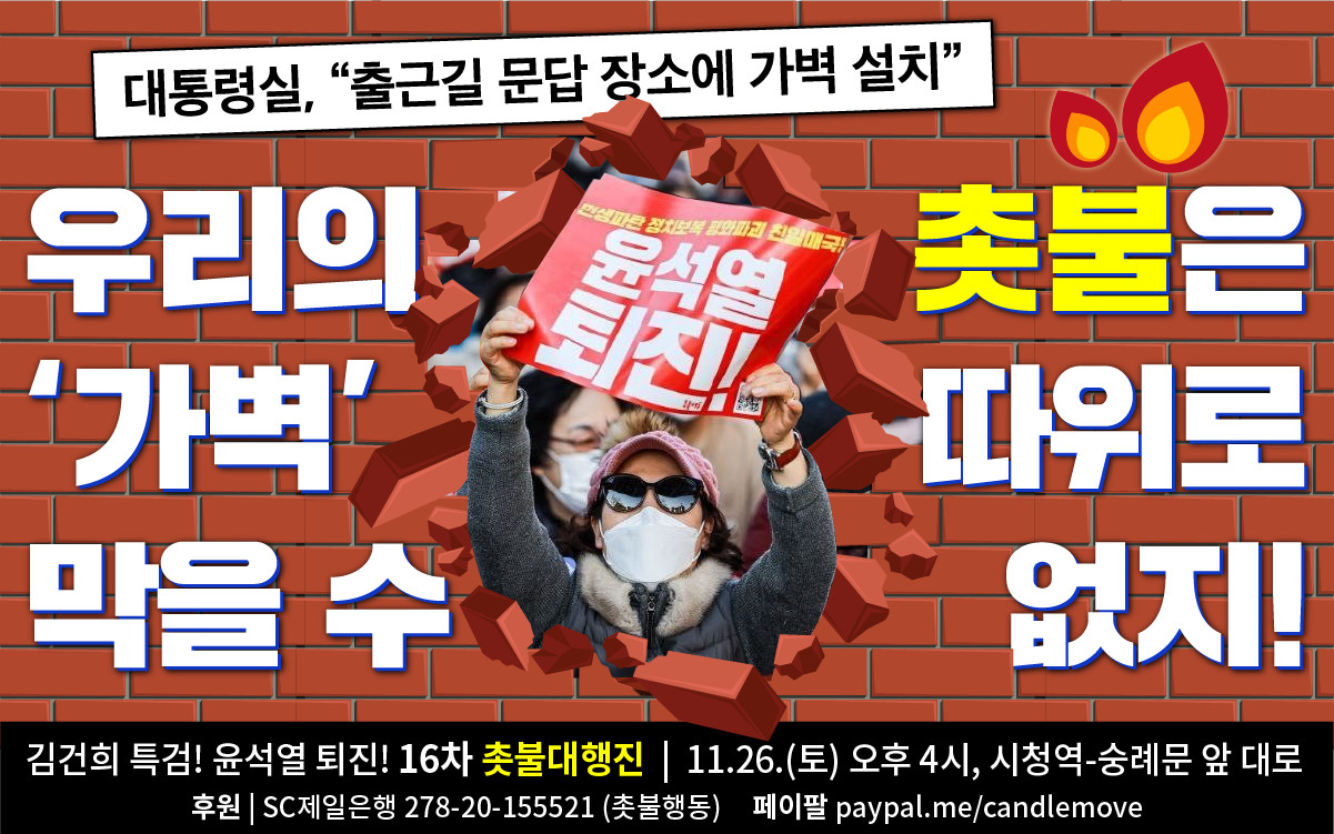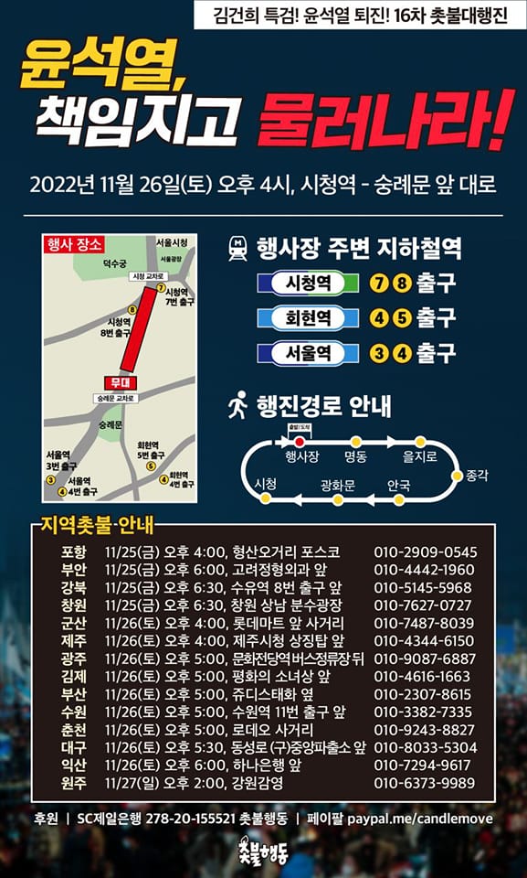 서울 11월26일(토) 4시 시청역 - 숭례문 앞 대로 김건희 특검, 윤석열 퇴진 16차 촛불 대행진