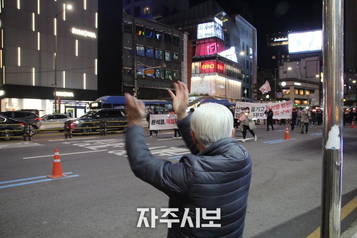 거리를 지나는 시민들은 발걸음을 멈추고 이들을 향해 손뼉을 치거나 함께 구호를 외쳤다. 행진 대열에 합류하는 시민들도 있었다.