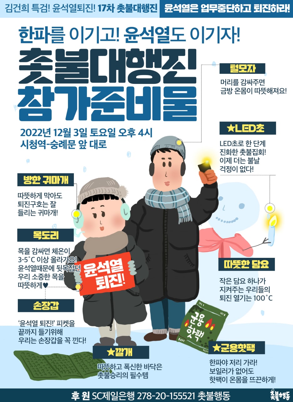| 12월17일(토) 김건희 특검 윤석열 퇴진 12월 전국 집중 19차 촛불 집회 일정 (0) | 2022.12.08 |